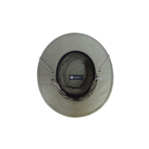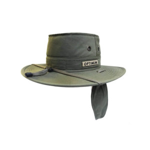 The Optimum is the ultimate outdoors hat. Water resistant Teflon coated poly/cotton wide brim hat with concealed legionnaires neck flap. The crown can be squashed flat and will bounce back in shape. This hat also has a floatation pad in the crown, adjustable double chin cord with toggle & keeper, sewn compartments on the outside band for golf tee or fishing fly, two brass mesh side eyelets, and a concealed pocket for cash or keys.