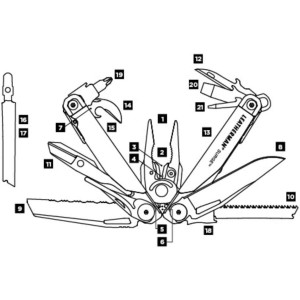 The blade exchanger lets you choose between a saw or a diamond & wood/metal file and lets you easily replace these tools when they are worn out. The 154CM wire cutters are replaceable, meaning you can repair or re-sharpen them on the spot. The blade exchanger, two knives & extra-strong scissors are easily accessed from the outside of the tool. Inside the sculpted handles are two-bit drivers, a hollow ground screwdriver, bottle/can opener & a awl with a thread loop.