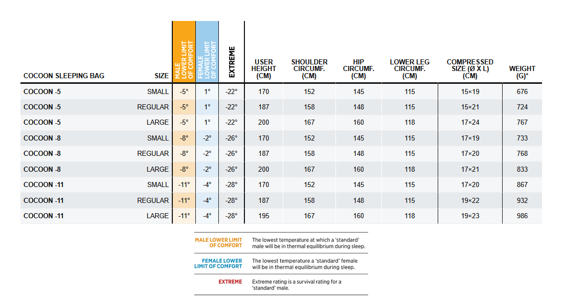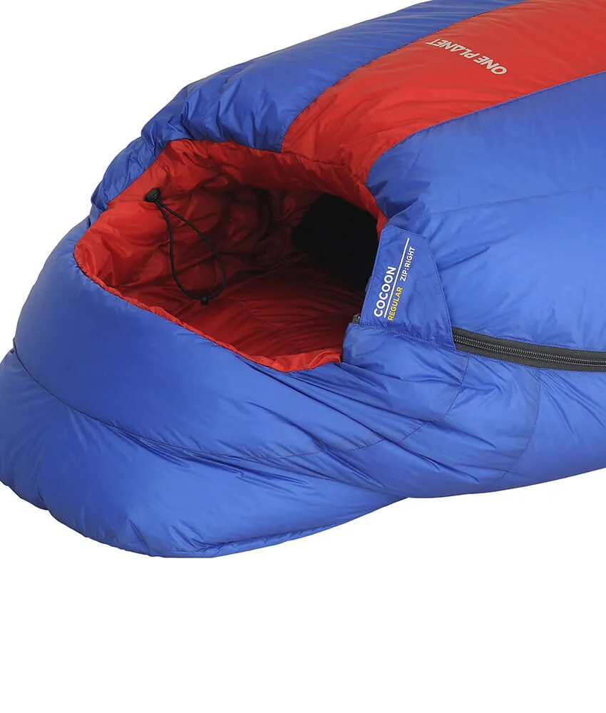 The Cocoon sleeping bag has an awesome warmth-to-weight ratio without compromising on comfort, a full and cosy hood ensures its ideal for light, fast multi-seasonal adventures. Featuring Storm foot technology: water- and wind-proof, breathable fabric on the footbox. Bags in this series are available is three temperatures, rated to the lower limit of comfort for both males (M) and females (F): -5 M (+1 F) °C or -8 M (-2 F) °C or -11 M (-4 F) °C ISO 23537.1 tested in accordance with ISO 23537.1. The Cocoon comes in small, regular and large sizes and is filled with 800-850 loft Non PFC Hydrophobic Down. The 10-denier Vapour Vent V2 fabric used in the shell and lining is ‘downproof by construction’, offering exceptional breathability, water repellency and durability. The generous shape allows wriggle room, while the Vertical-V baffles and a draught tube keep warmth in. The full-length YKK #5 locking zip opens from the foot for ventilation, while the anti-snag slider combines with our protective draft tube to stop jamming.