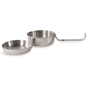The cooking set includes a pot with a lid that can be closed tight with a camp lock, which, when it’s folded out, the lock serves as a handle for the pot. The parts themselves can also be used as a bowl and plate.